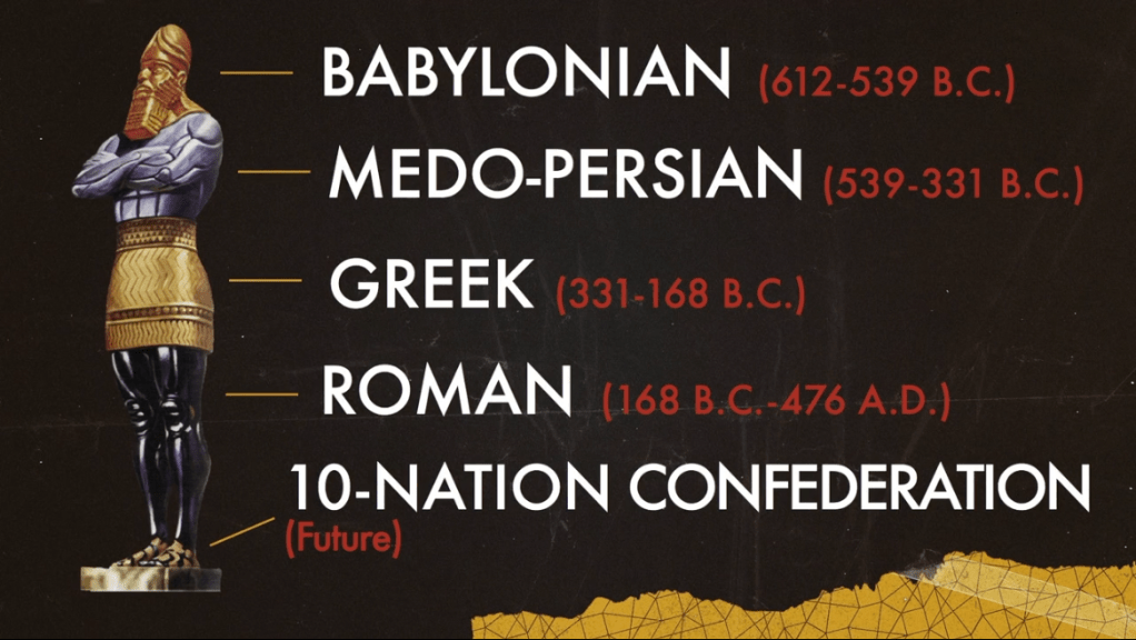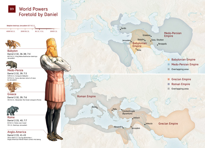 Most scholars agree on the kingdoms represented in the first 4 parts of the statue (hindsight is 20/20), but there is debate on the 5th world power. Some see it as a mix of America and Britain (Anglo-American), having aspects of the Roman empire (iron) woven throughout. Some believe this kingdom hasn’t come yet. See the two charts below: