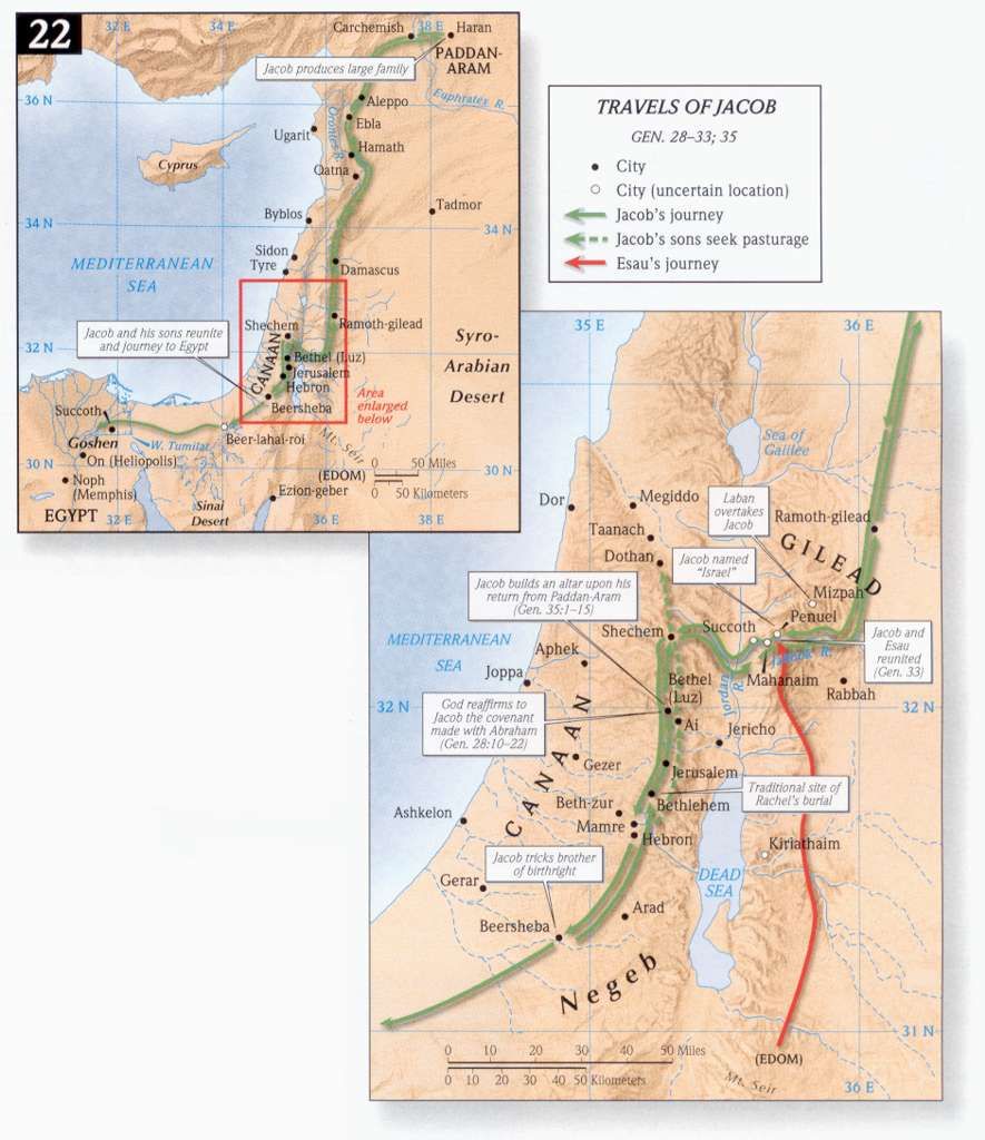 While Jacob is on his way he stops at “a place”, takes a stone from “the place” and then lies down in “the place”. This place, formerly known as Luz, is now called Bethel, the House of God. Abraham had been here before and set up an alter to the LORD. Now God meets Jacob in this same “place” and gives him the blessing of Abraham.