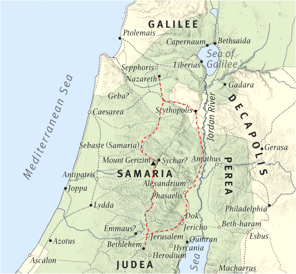 Mary and Joseph traveled from Nazareth to Bethlehem for a census and found the city was crowded when they got there. The time of year this happened was during the Feast of Tabernacles when Jerusalem, just 5 miles north of Bethlehem, would have been crowded by Jewish people from all around coming for the Pilgrimage Feast. There are two possible routes Mary and Joseph could have taken. The shorter direct route goes through Samaria. The Samaritans were considered enemies of the Jews. The other route would have taken them down by the Jordan River valley and then had them climb back up to Bethlehem at the end. Either way, the trip was around a week on foot.