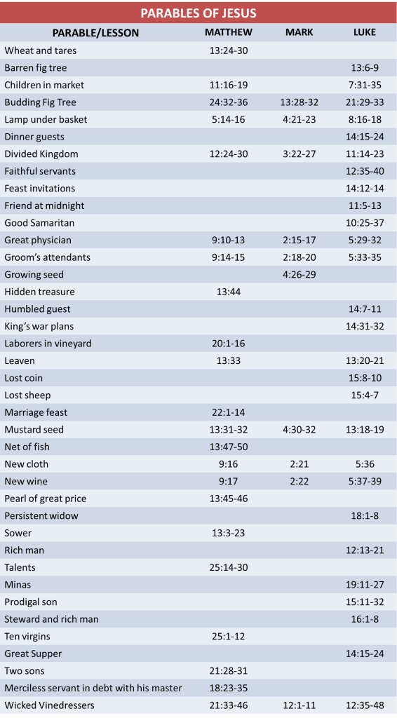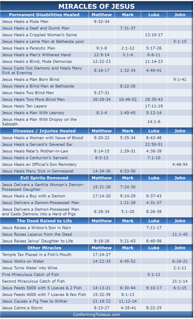 Between Jesus’ baptism at age 30 (The Jewish Levites began their priestly service at age thirty (Numbers 4:3, 23, 30, 35) and His death at age 33 (based on the number of Passovers recorded in John and the other events of His ministry), He performs many miracles and teaches many parables. Here are a couple of charts organizing the two: