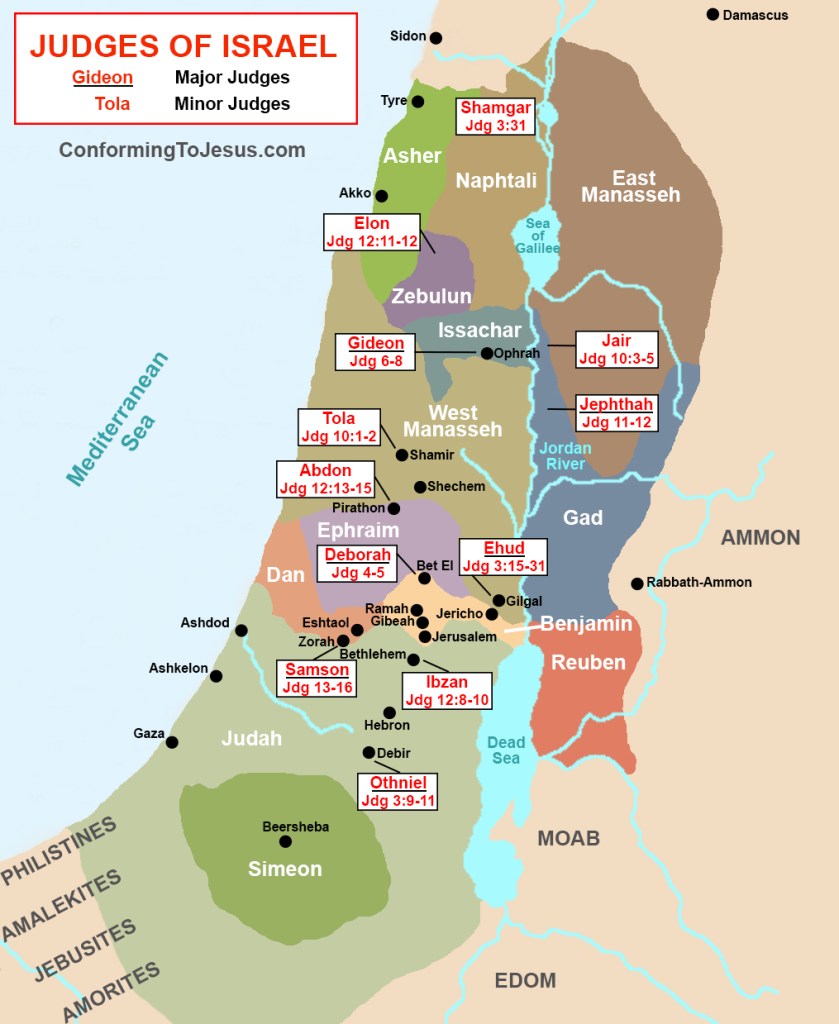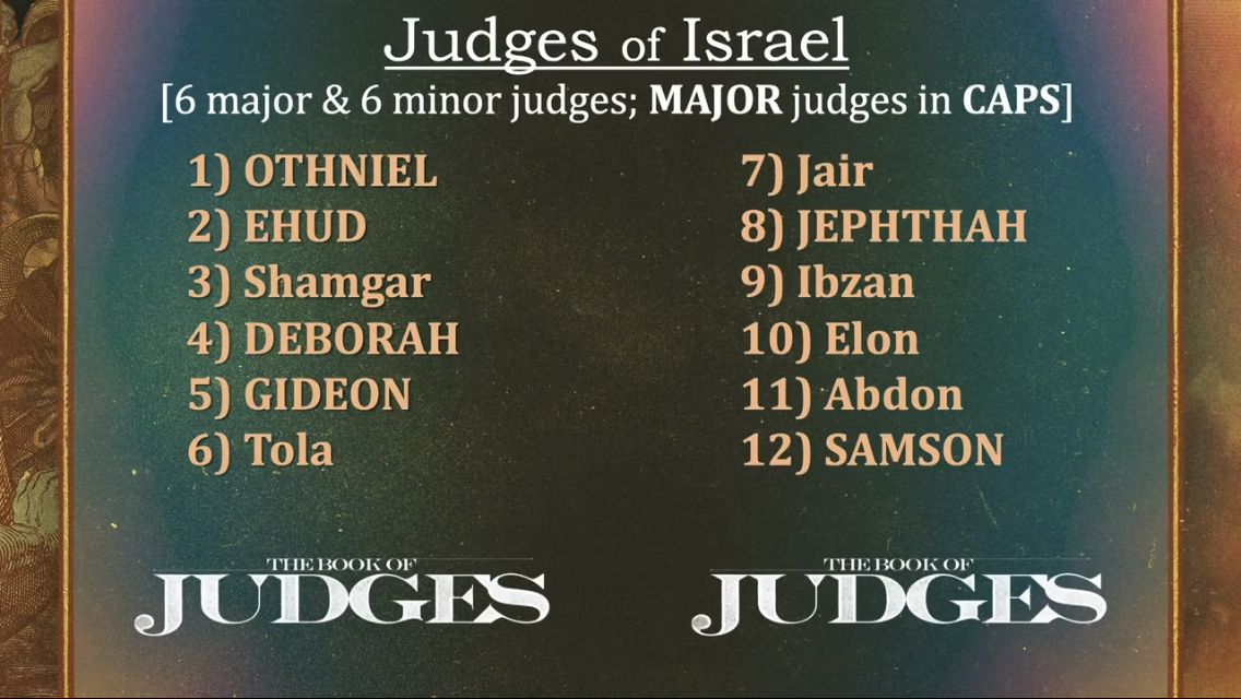 There were at least 12 judges during this time. Those listed in the chart below are the judges by name in the book of Judges. We see a few more in the book of 1 Samuel but for now we will focus on the ones listed in this book.