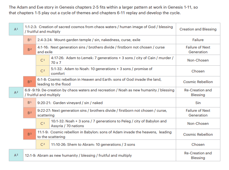 Genesis 9:20-27 tells us about an unfortunate incident that happens. Noah and his family create a garden complete with a vineyard. This takes some time to mature so don’t imagine the wine was produced immediately after the flood. You can bet at least 3-4 years if not more went by before that first harvest of wine was produced. Noah ends up drinking too much one day and again there is nakedness and shame in a garden. The “Garden Curse” is back and the pattern continues. Check out this chart from The Bible Project Classroom: