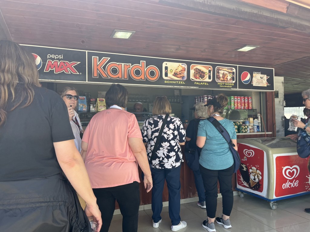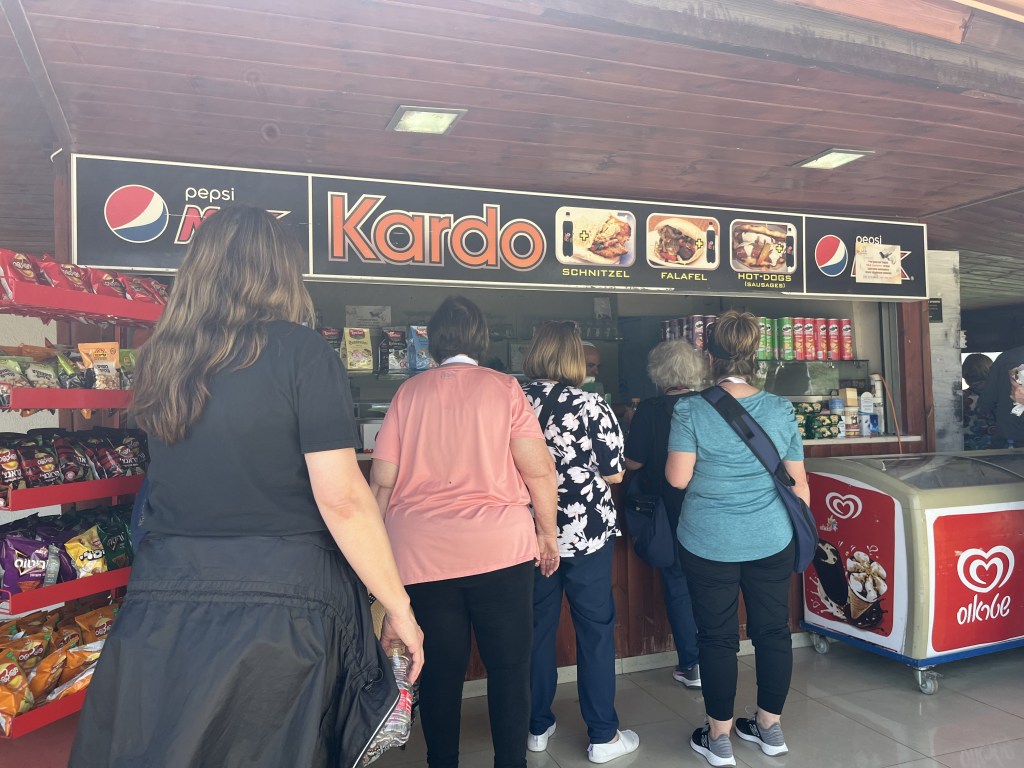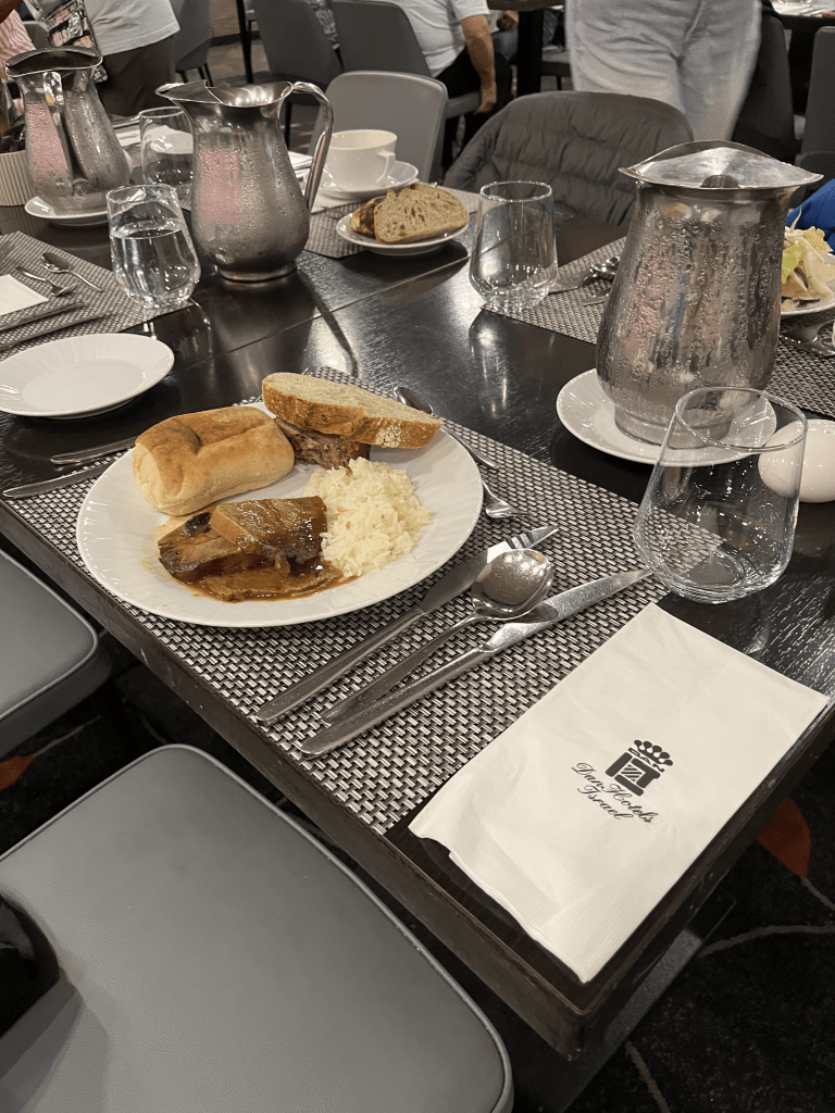 We learned a very important cultural lesson while staying here. You can not mix meat and dairy during a meal. It’s not kosher. We noticed this when we couldn’t find butter at dinner time. It was only out at breakfast. Someone in our group took a bunch of butter from breakfast and tried to smuggle it in during dinner. They were caught and told to take the butter back to their room. The next day, we found a Papa John’s pizza place down the road and enjoyed some cheese mixed with pepperoni on a pizza. When we tried to bring leftovers into the dining hall of the hotel, we were stopped and said it was not allowed. The worker kindly explained the reasoning to us and we were respectful. It comes from the Scriptures about not cooking a kid (baby goat) in its mothers milk. So the people have taken this a step further and prohibit the two in the same room together. They view it as mixing life with death.