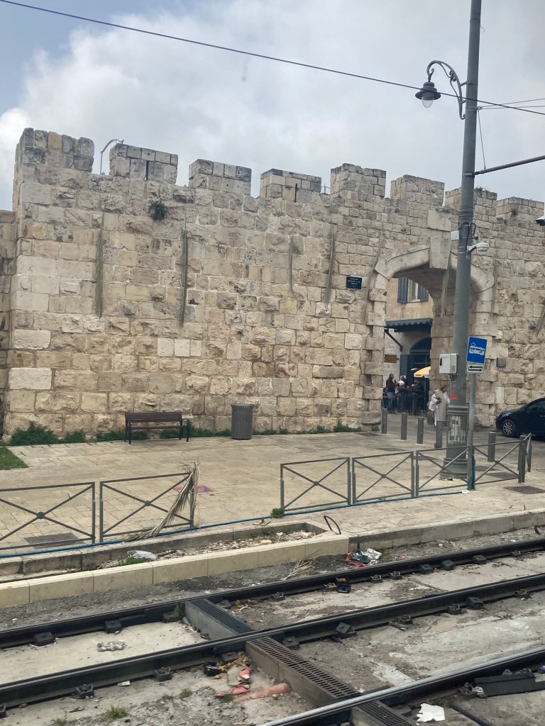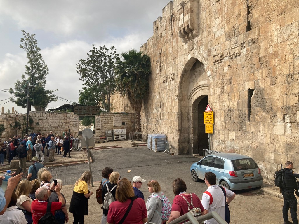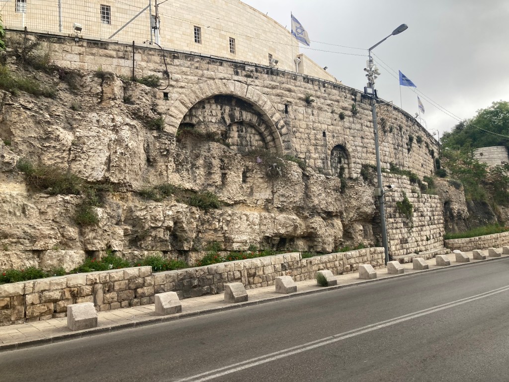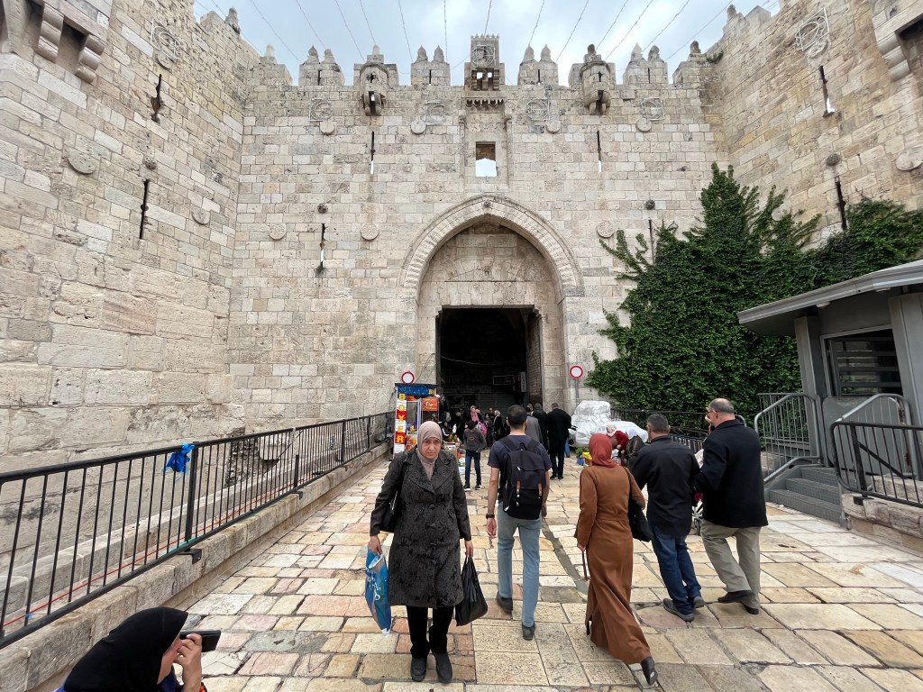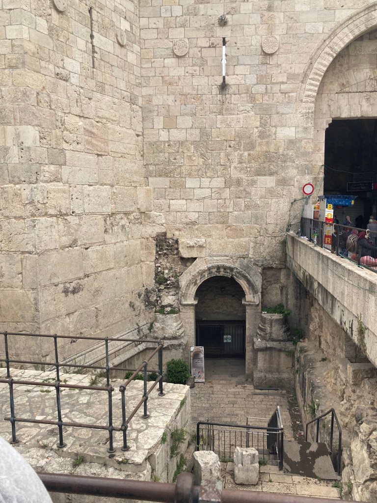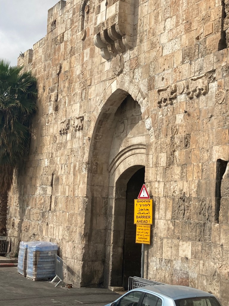 The Lion’s Gate, also known as the Gate of Jehoshaphat, St. Mary’s Gate, St. Stephen’s Gate, and the Gate of the Tribes, is located on the eastern wall of the Old City, which rises above the steep western bank of the Kidron Valley. The gate is near the Temple Mount’s northern wall. It opens directly into the Muslim Quarter and is the gate closest to the first station of the cross on the Via Dolorosa. This area is very trashy. You’ll see that in our photos as we walk along the north then east side heading to the Lions’ Gate entrance.