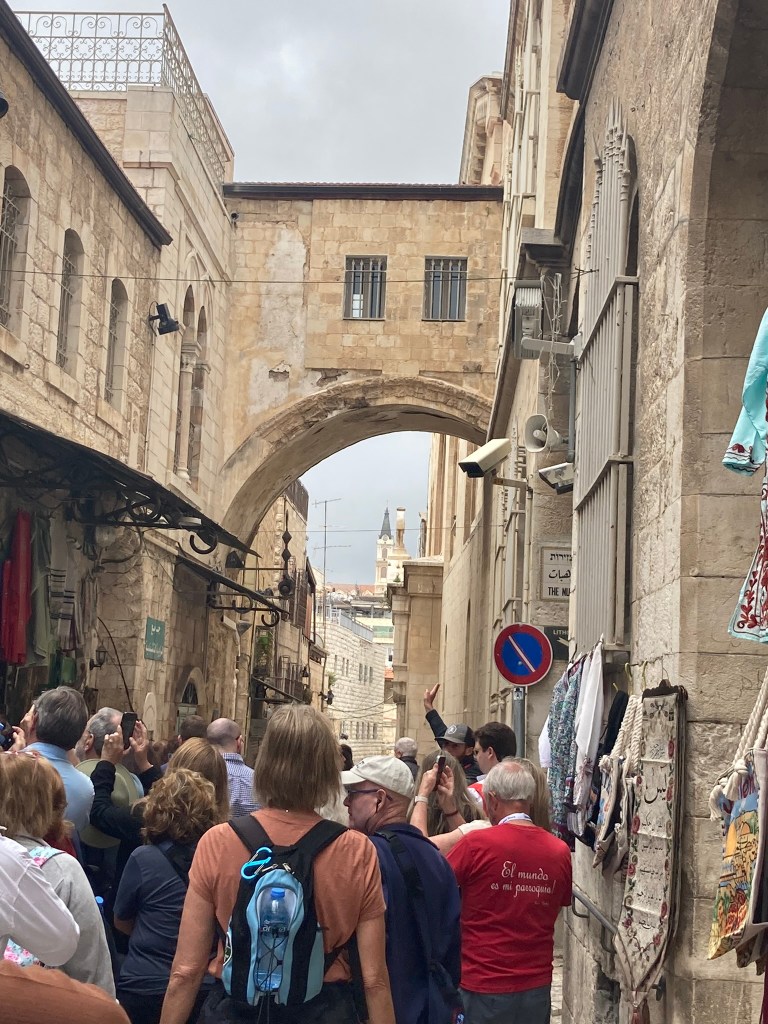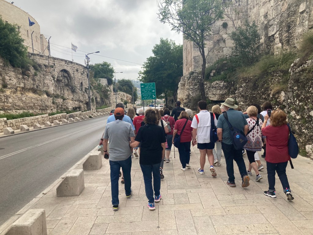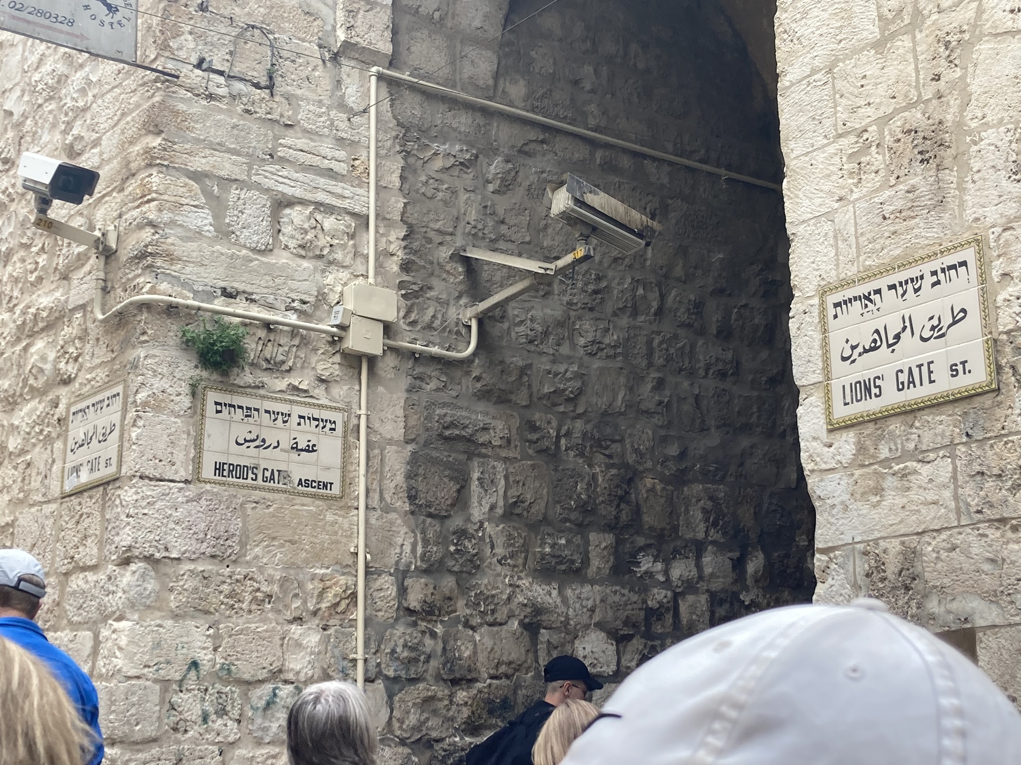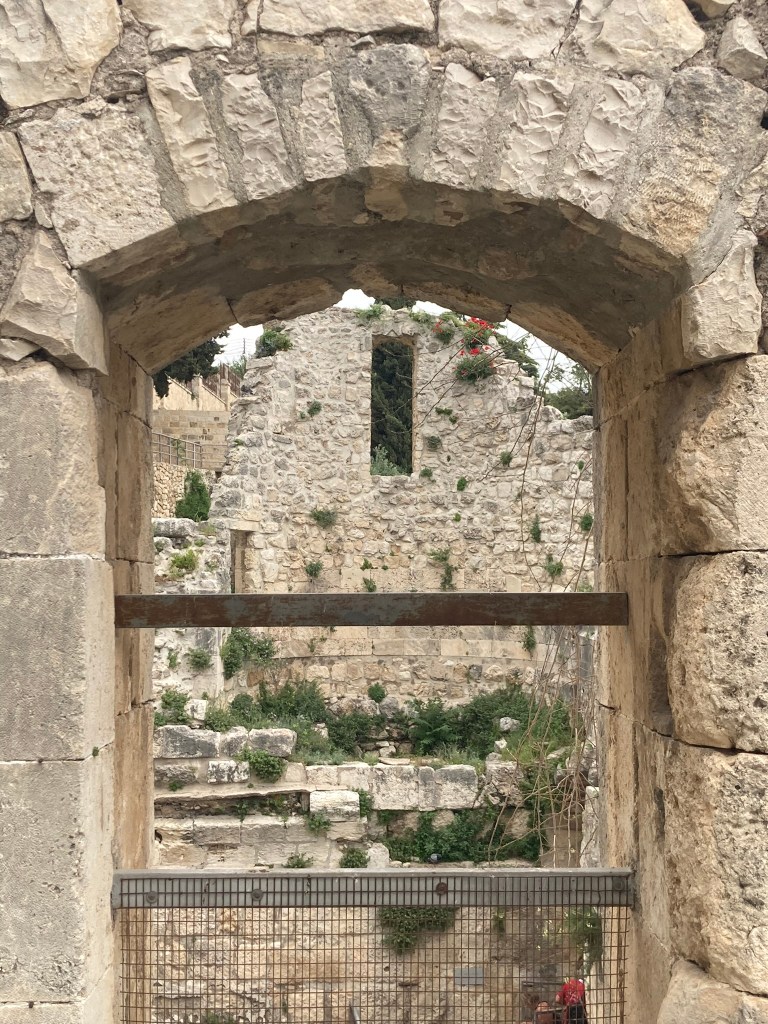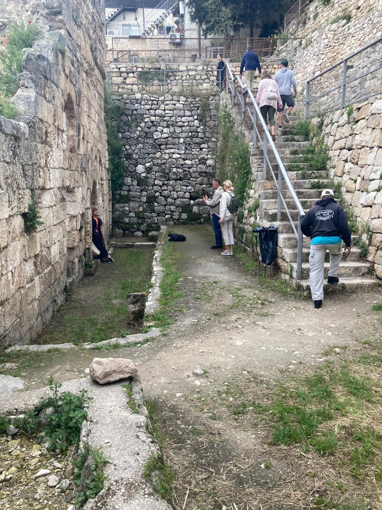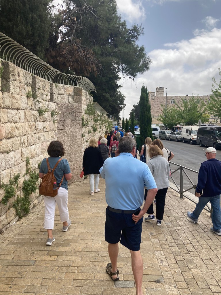 The Lion’s Gate, also known as the Gate of Jehoshaphat, St. Mary’s Gate, St. Stephen’s Gate, and the Gate of the Tribes, is located on the eastern wall of the Old City, which rises above the steep western bank of the Kidron Valley. The gate is near the Temple Mount’s northern wall. It opens directly into the Muslim Quarter and is the gate closest to the first station of the cross on the Via Dolorosa. This area is very trashy. You’ll see that in our photos as we walk along the north then east side heading to the Lions’ Gate entrance.