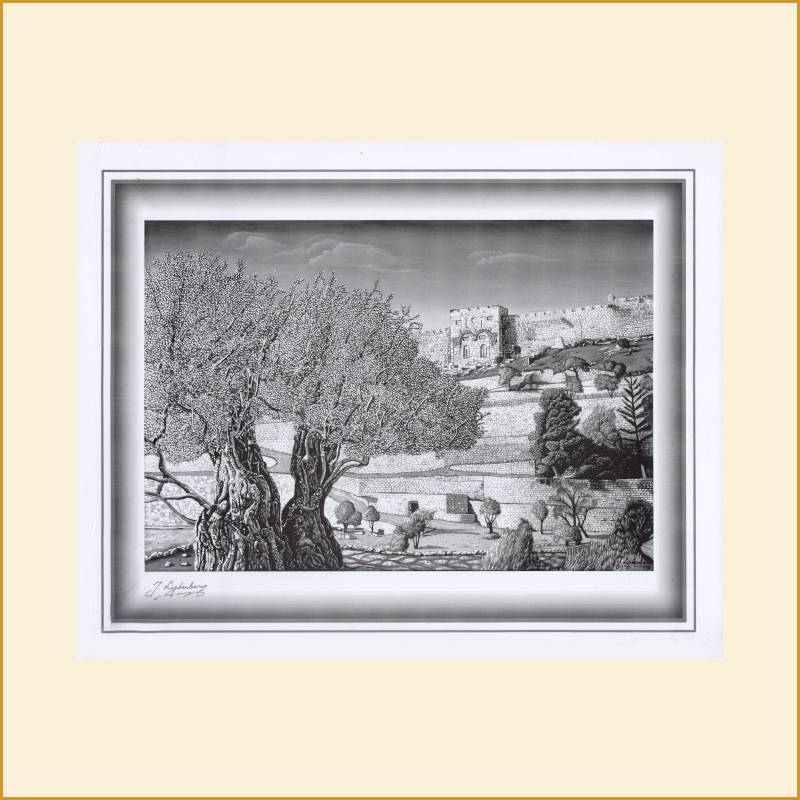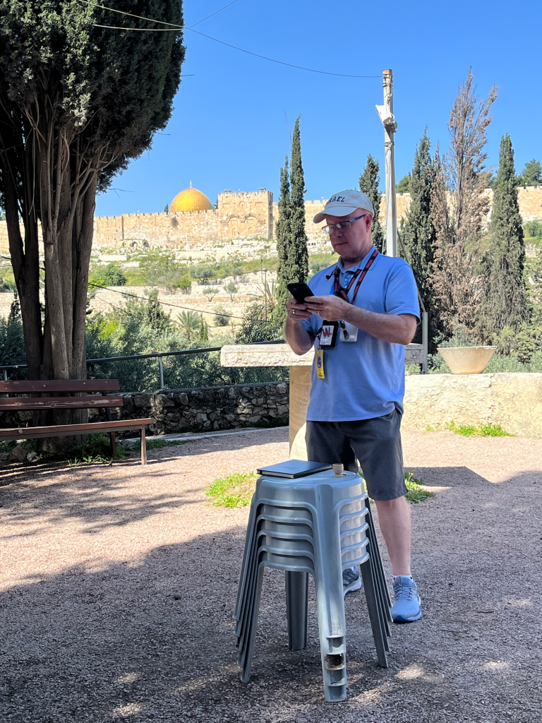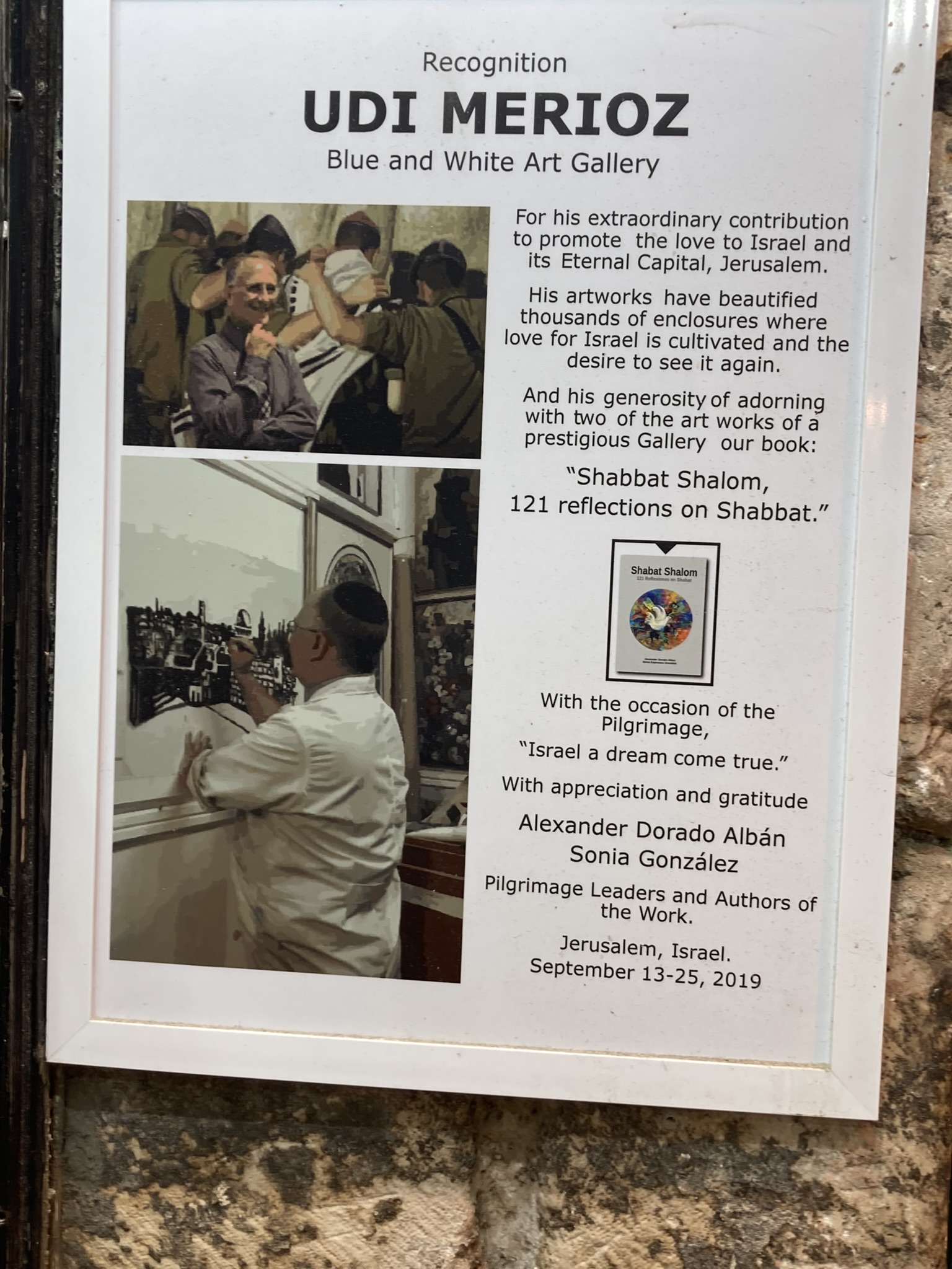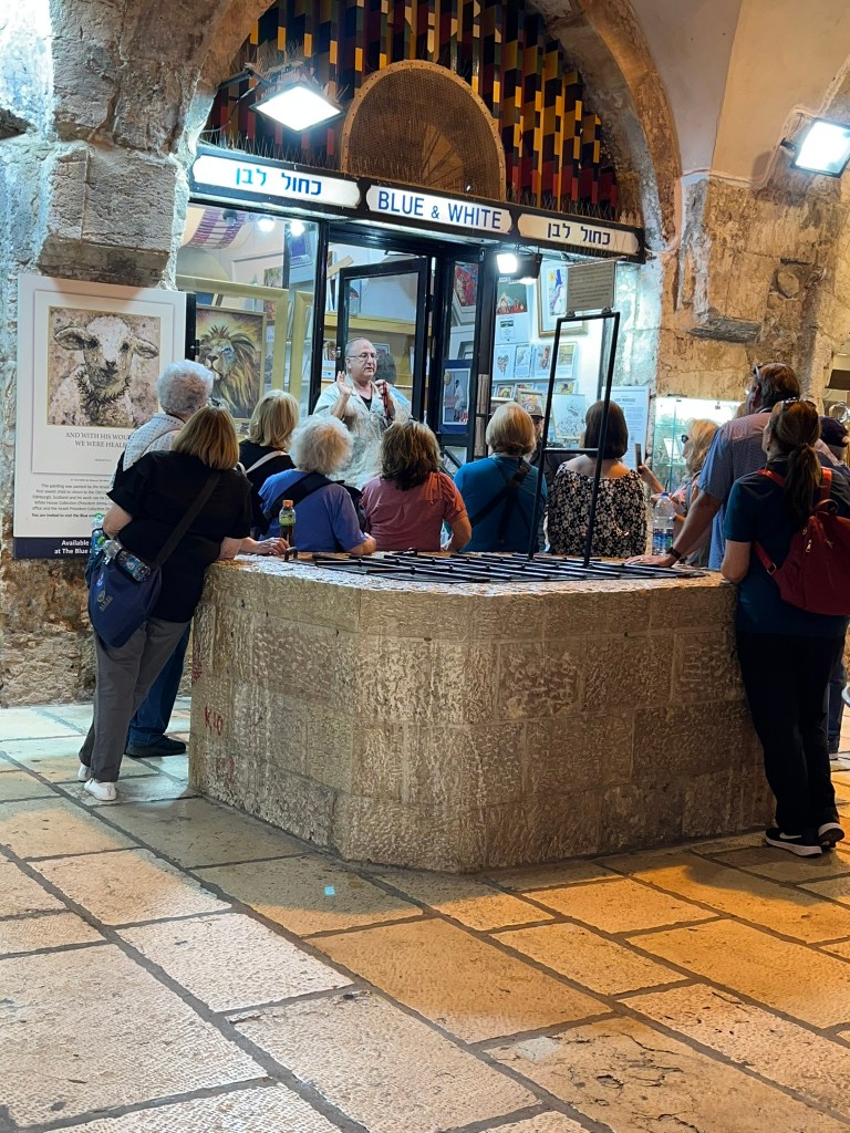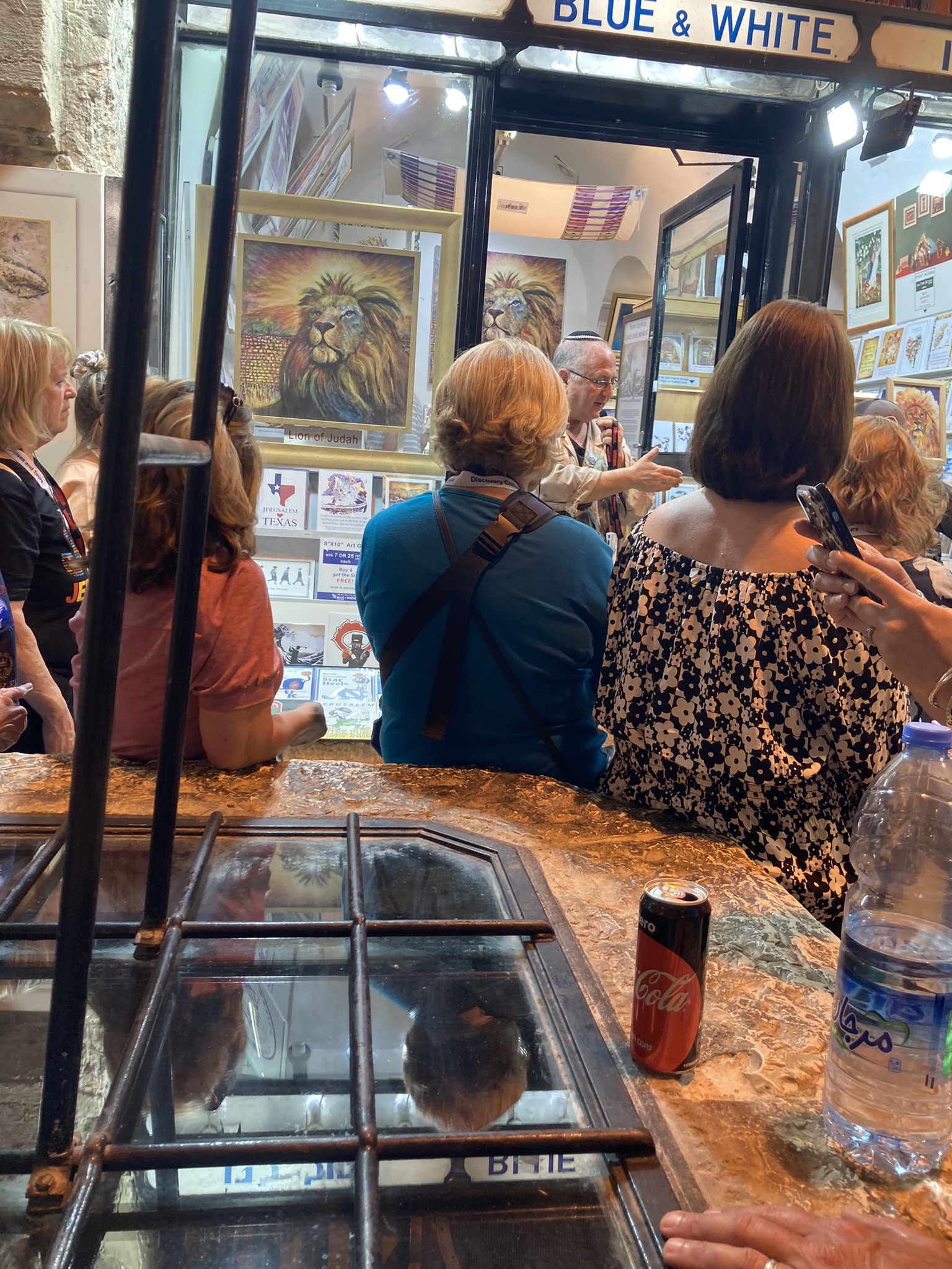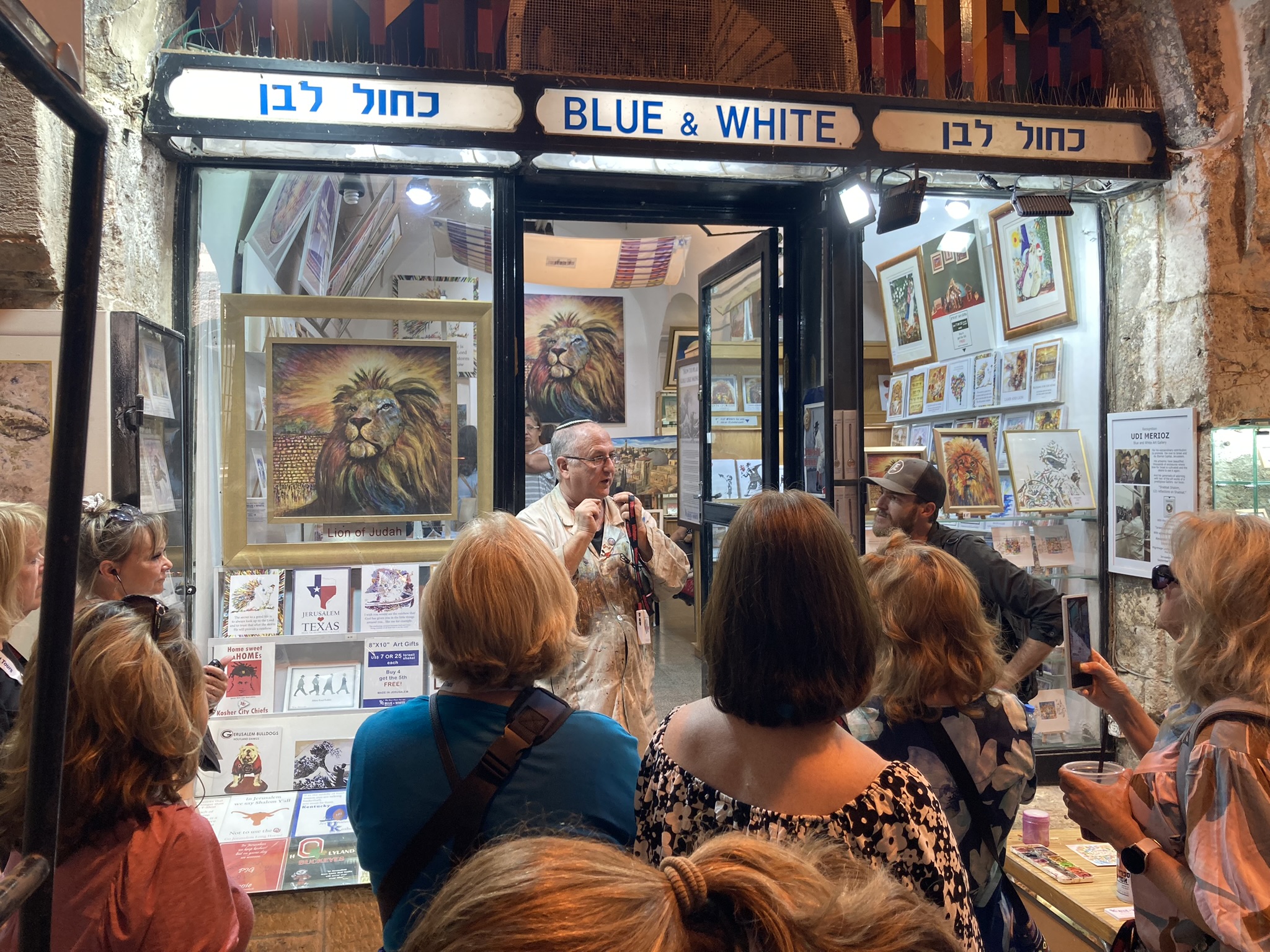 After lunch we went shopping at the Blue & White Art Gallery on HaKardo St. There we met the owner, Udi Merioz. He has a unique perspective on Jerusalem because his father fought for it in 1948, was one of the last Jewish defenders evacuated before the Quarter surrendered to the Arab Legion, and was the first to purchase land there when Israel freed it from Jordanian occupation in 1967. We had the privilege of hearing him tell his story. After, he let us all choose two prints to take home at no extra cost. I chose the Western Wall and the Eastern Gate as seen from the Garden of Gethsemane.